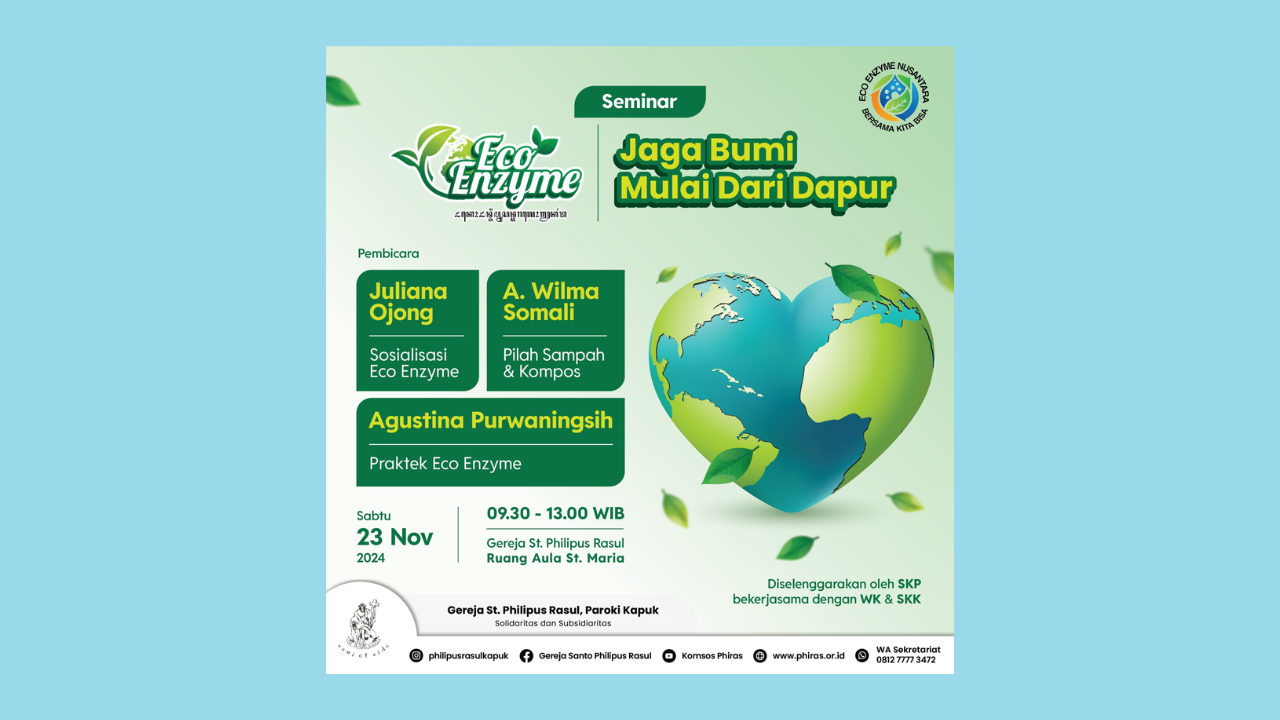 Sehubungan dengan pemanasan global dan menumpuknya limbah sampah organik yang belum dimanfaatkan, maka kami dari Seksi Keadilan dan Perdamaian (SKP) Gereja St Philipus Rasul bekerja sama dengan WKRI Katolik, dan Sie. Seksi Kerasulan Keluarga akan mengadakan Seminar tentang Eco Enzymdengan thema: “Jaga Bumi Mulai Dari Dapur”Seminar akan diadakan pada:📆: Sabtu, 23 November 2024⏰: Pkl 09.30 …