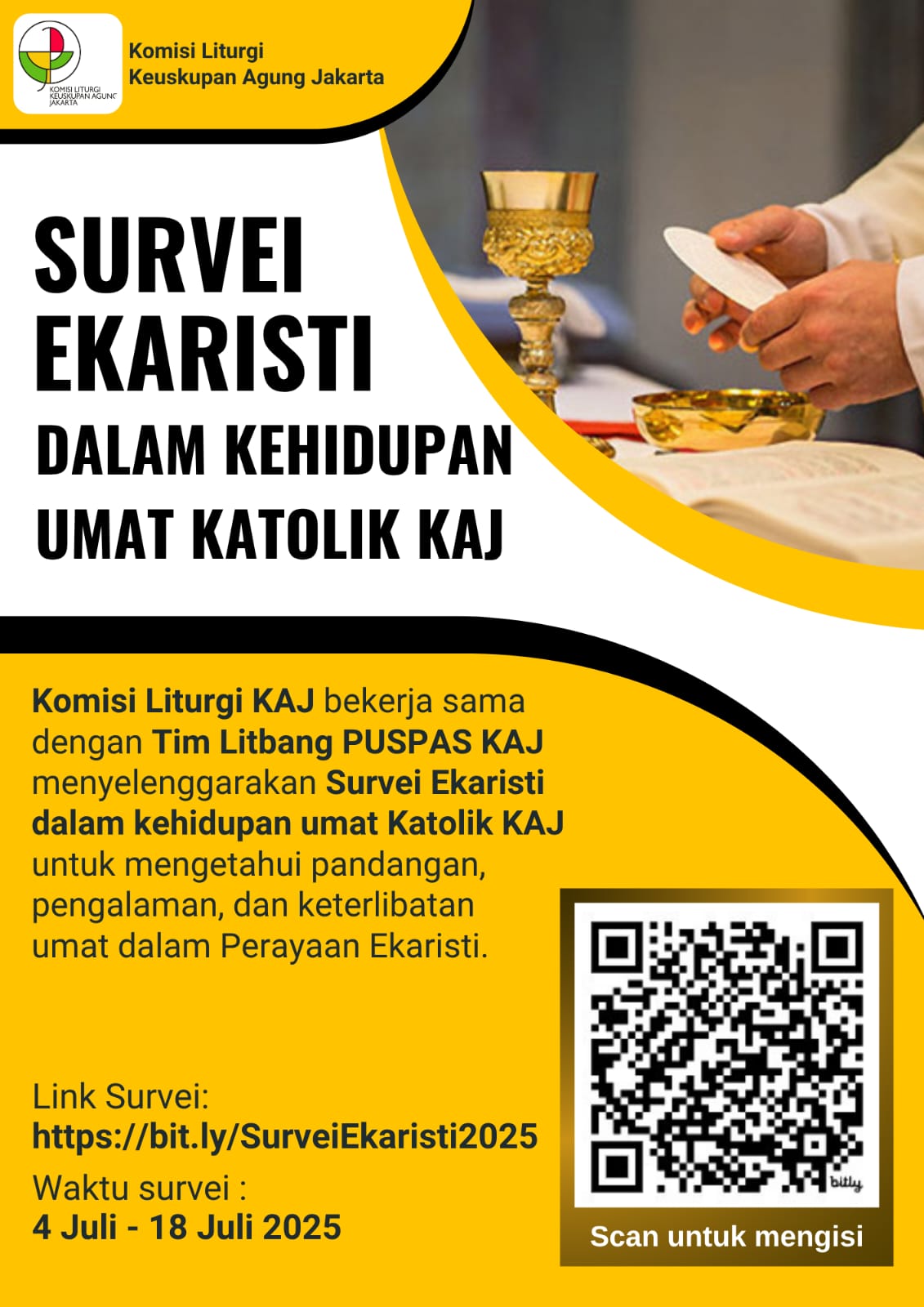 Mohon bantuan dari Bapak/Ibu semua untuk membantu mengisi survey yg diadakan oleh Komisi Liturgi KAJ, di link berikut (https://bit.ly/SurveiEkaristi2025).